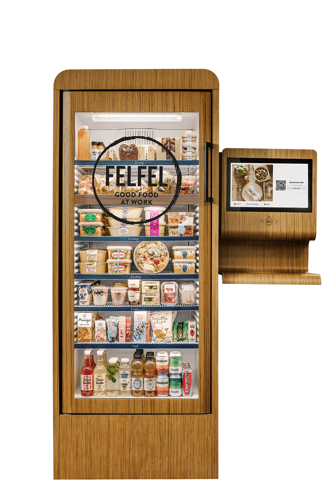 Doté d’un écran tactile intuitif, le frigo FELFEL permet de visualiser les ingrédients, allergènes, valeurs nutritionnelles et même l’origine des produits. Le paiement est fluide : carte bancaire, badge entreprise ou application mobile. L’achat se fait en libre-service, sans bruit, sans file d’attente, avec une logique de consommation sur place ou de vente à emporter.